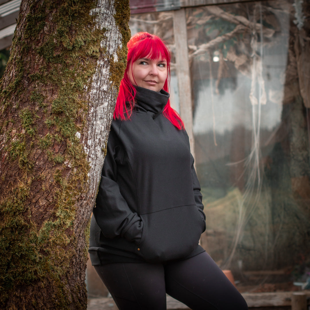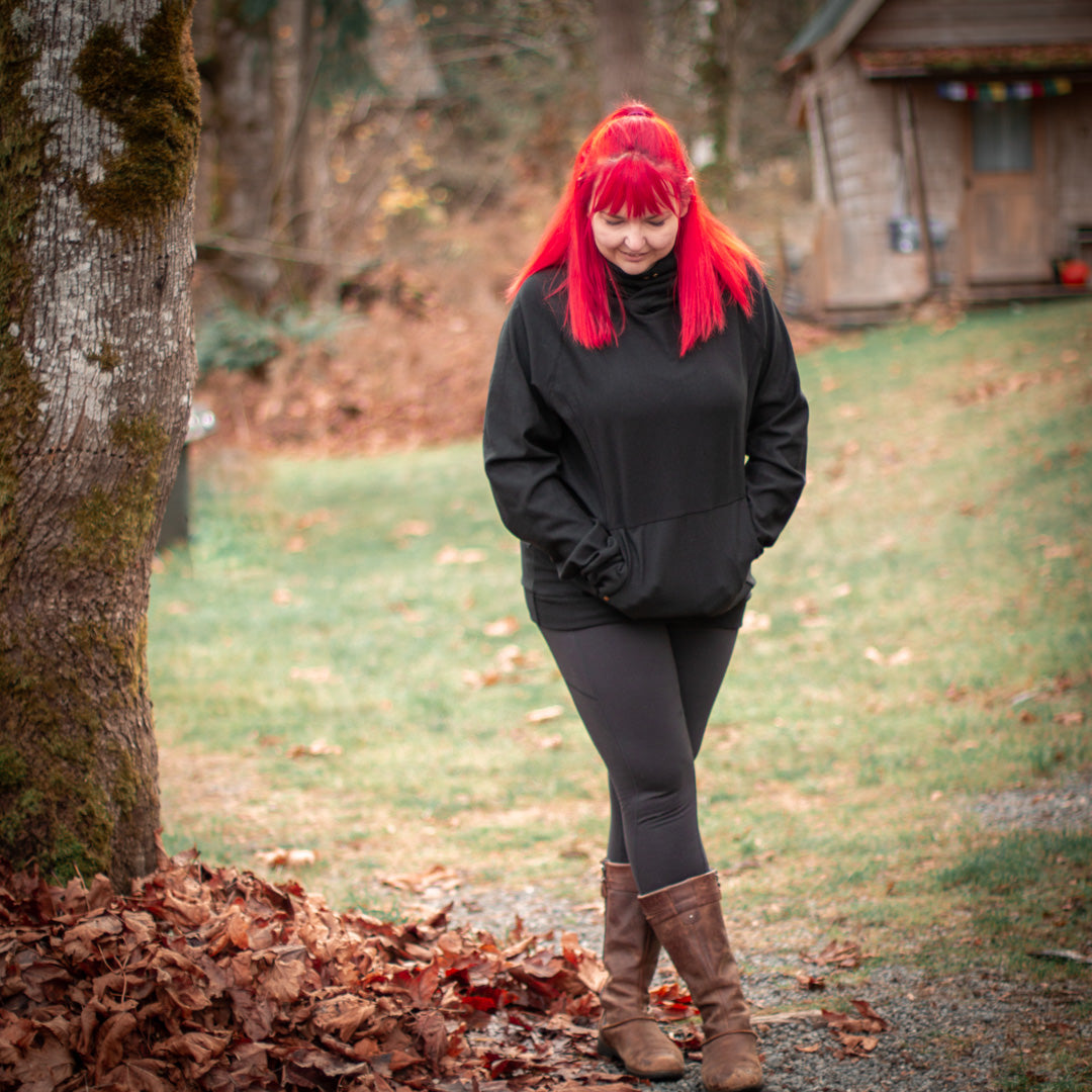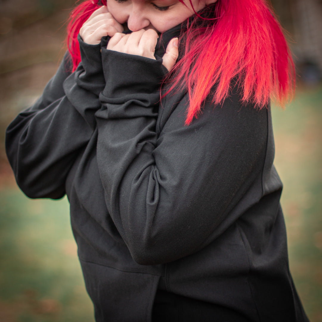Fabric is a medium weight stretch fleece knit. First model is wearing a medium, second model is wearing a large, Woman is wearing an oversized XL.