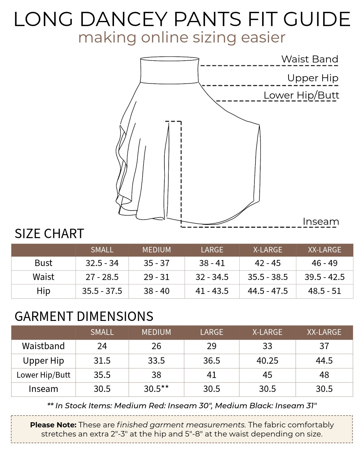 • Inseam measurements are from the crotch to the desired length of pant. Please email us with your inseam and outseam if you want your item custom hemmed.